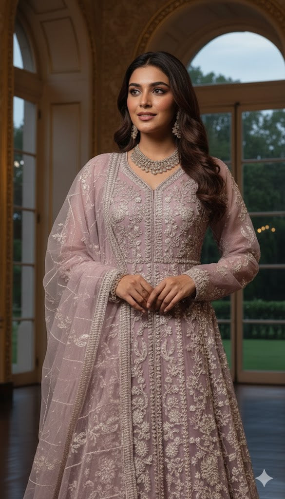 A flowing open gown style organza maxi adorned with tilla, sequins, pearls, fresh stone settings, and delicate handwork exudes pure elegance. The can-can adds volume for a dramatic fall, while the embroidered organza dupatta and grip trousers complete this statement-making festive look.