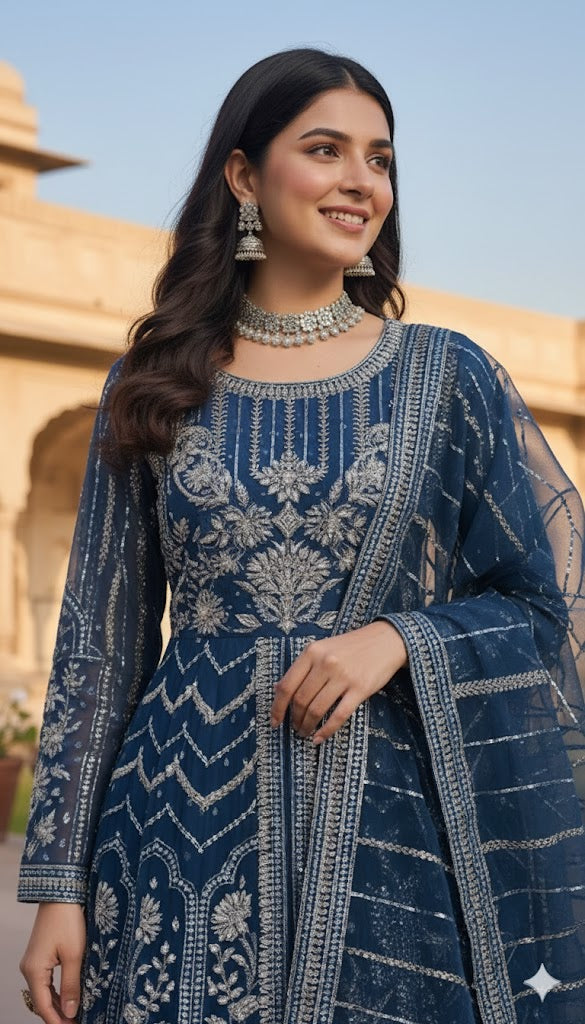 Maxi: Open gown style organza maxi with attached inner, approx. length 58–60 inches, detailed with tilla, sequins, pearls, fresh stone settings, and hand embellishments, can-can attached