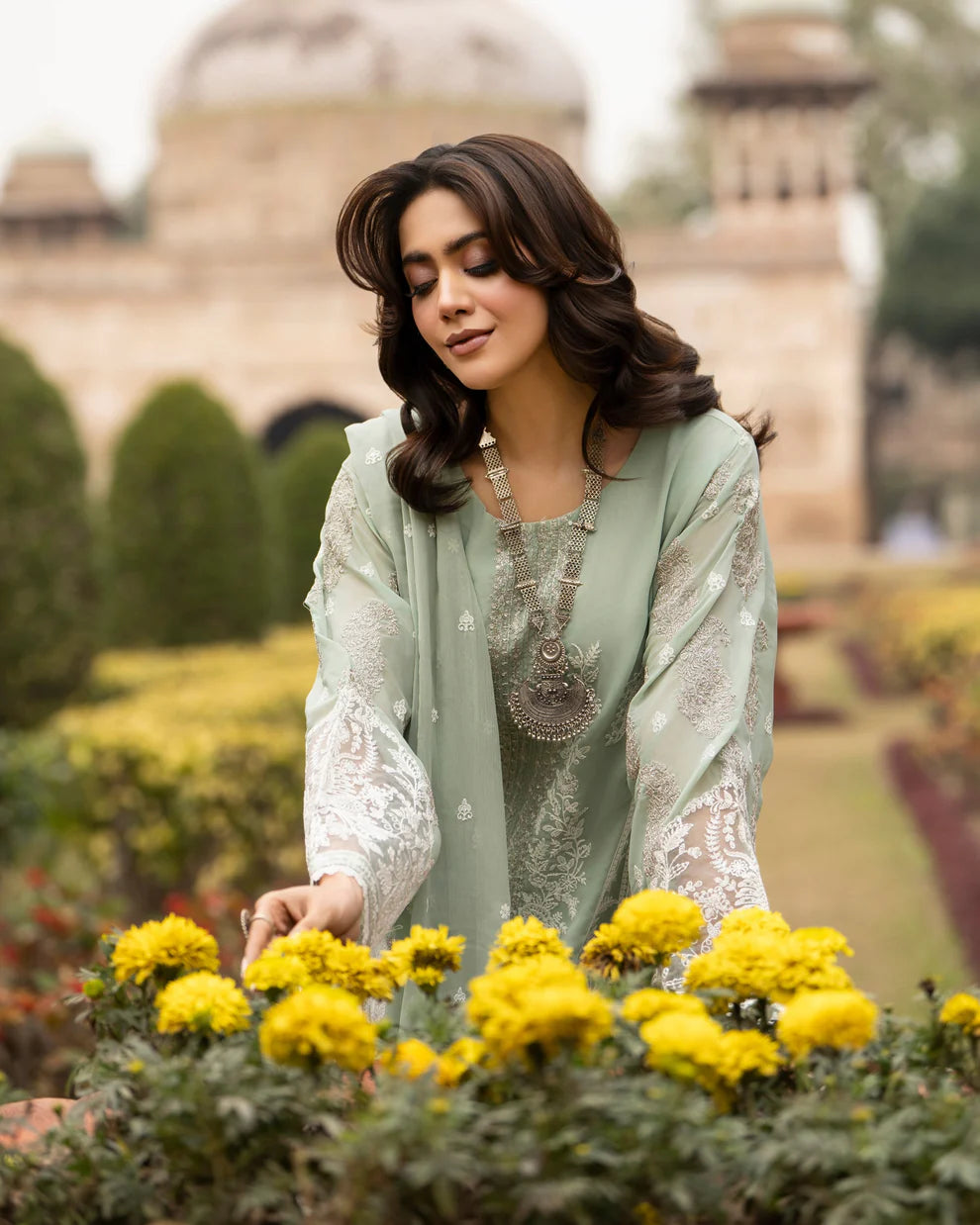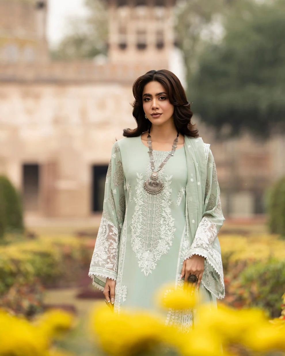 Dupatta: Chiffon dupatta featuring intricate all-around embroidery, adding lightness and an elegant layered dimension.