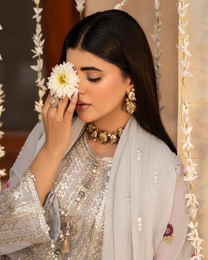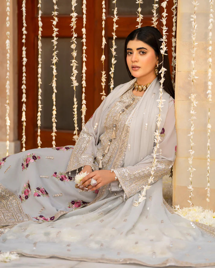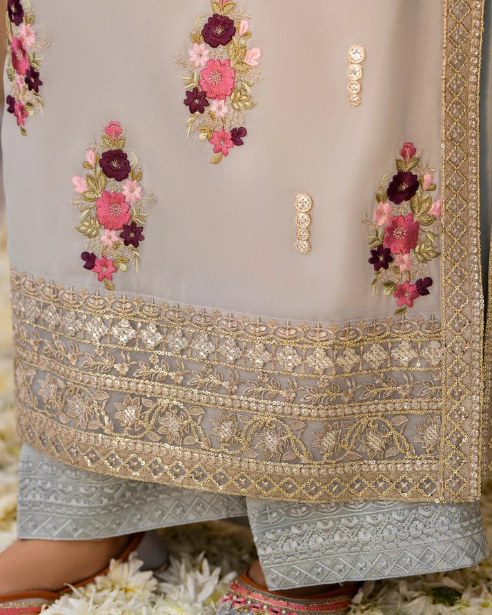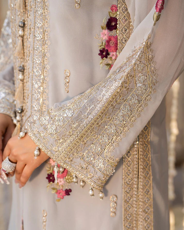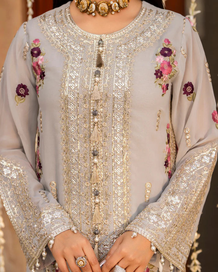 Shirt: Georgette chiffon shirt with sequence, panni, and multi-thread embroidery, finished with tussels on neckline and sleeves.