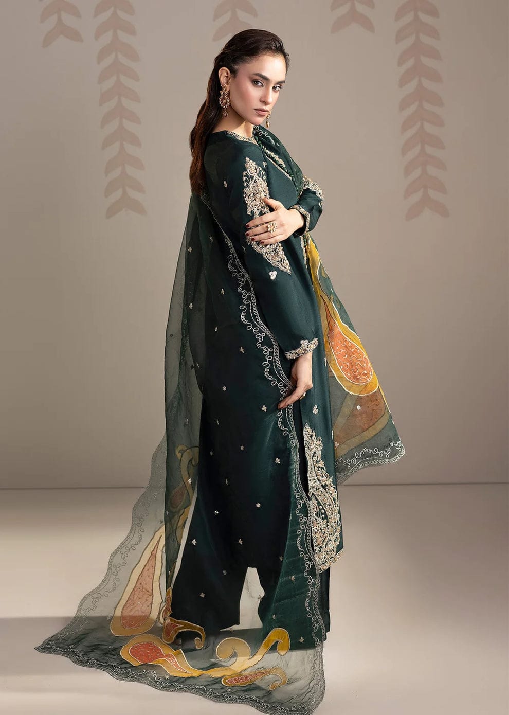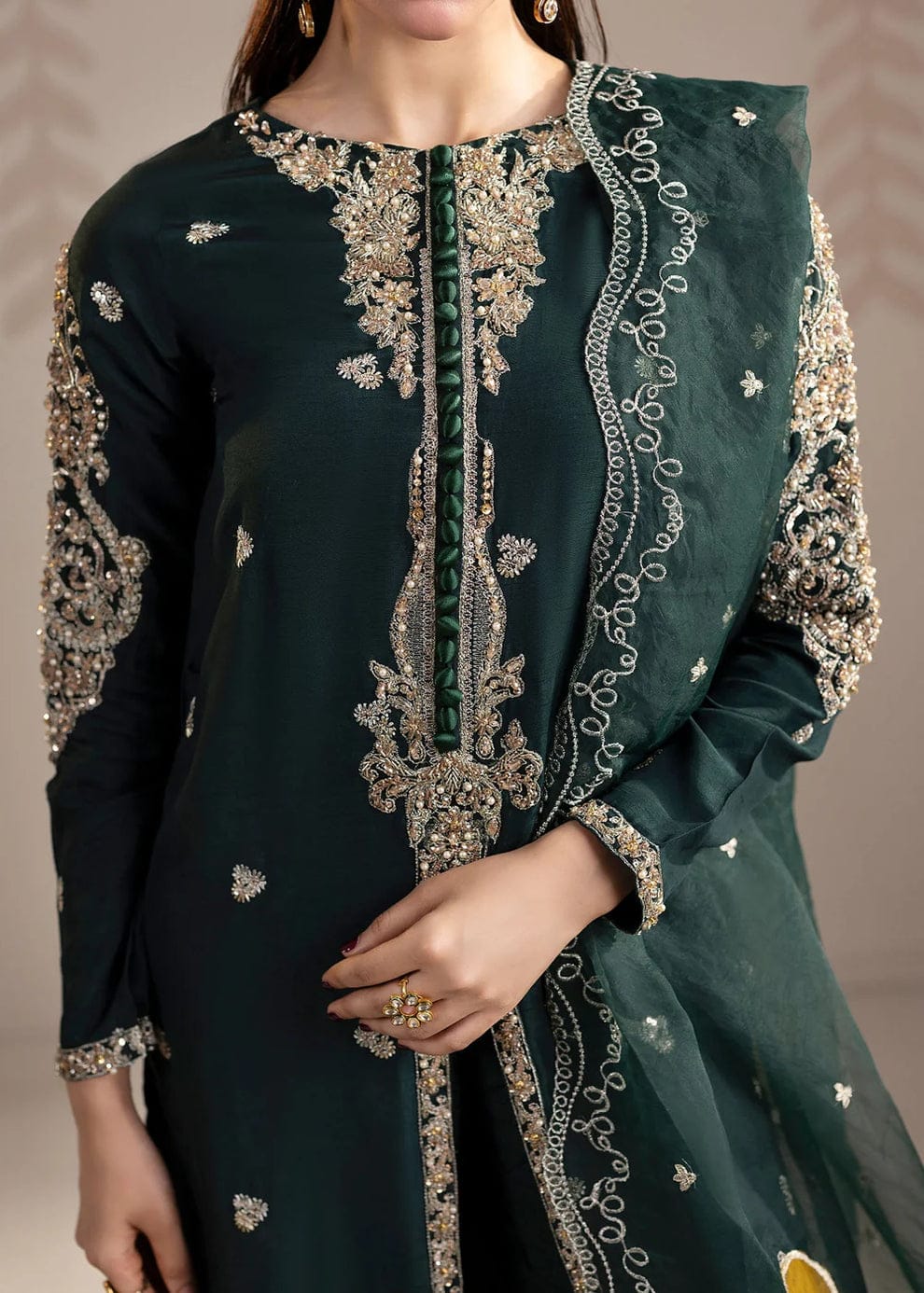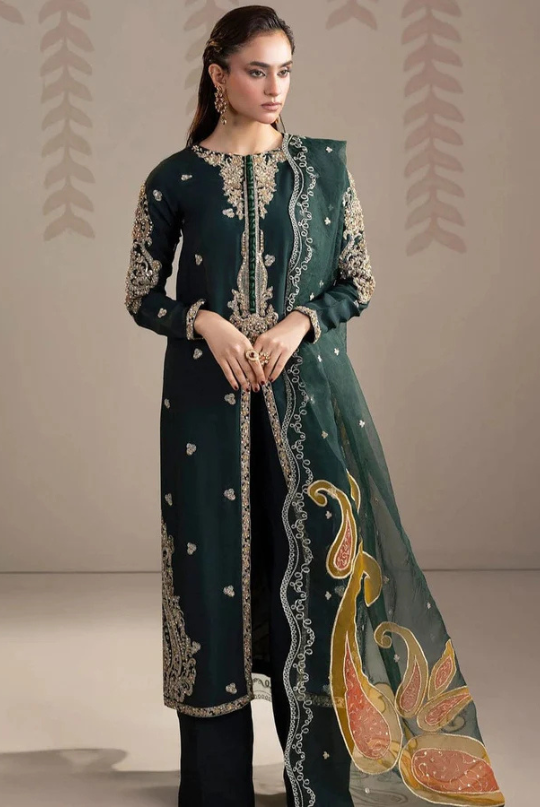 Step into effortless elegance with this striking green ensemble. Crafted in rich raw silk and paired with an organza dupatta, the outfit exudes sophistication, while heavy embroidery and embellishments make it perfect for festive occasions, evening events, or dawat gatherings.