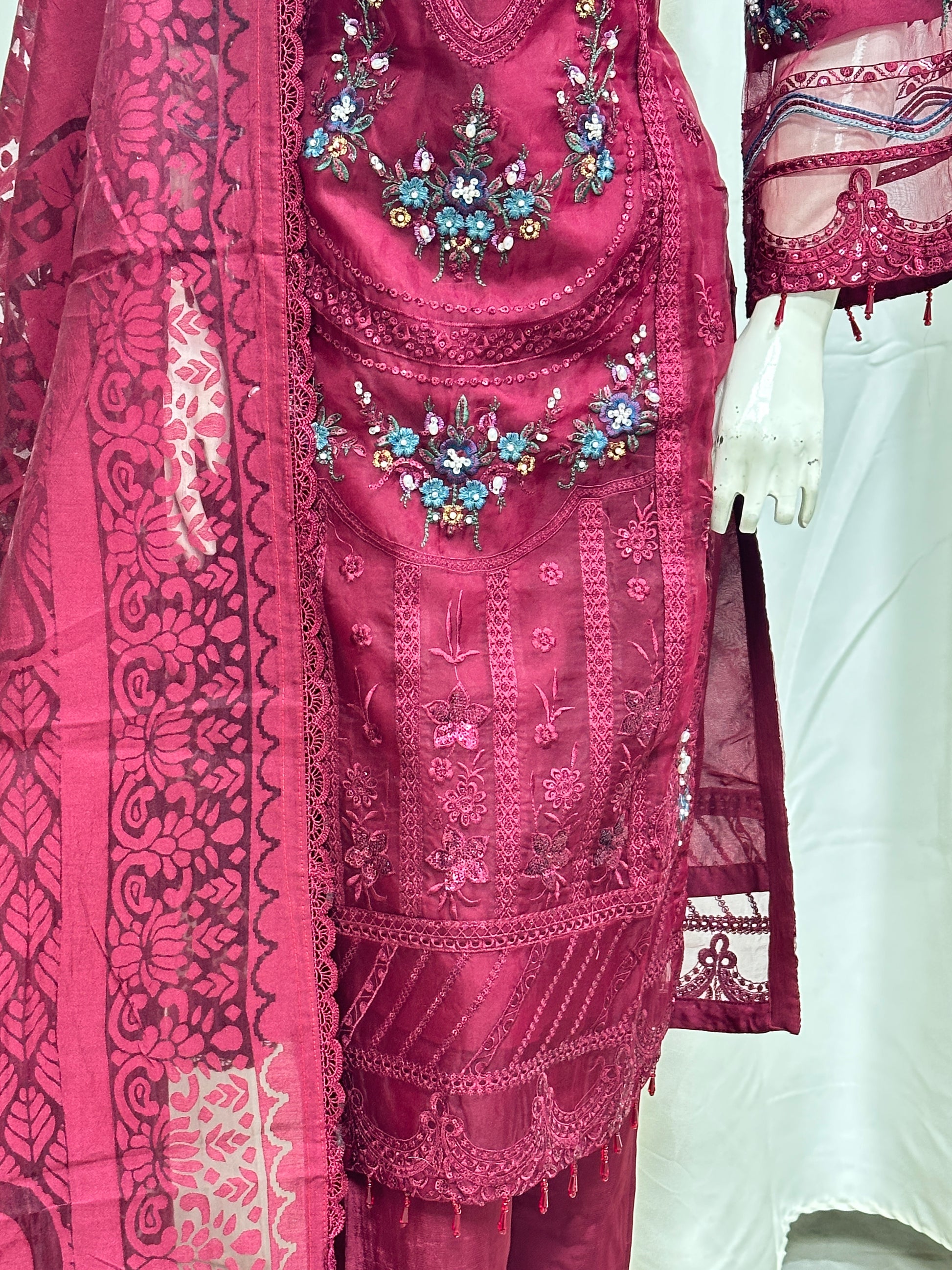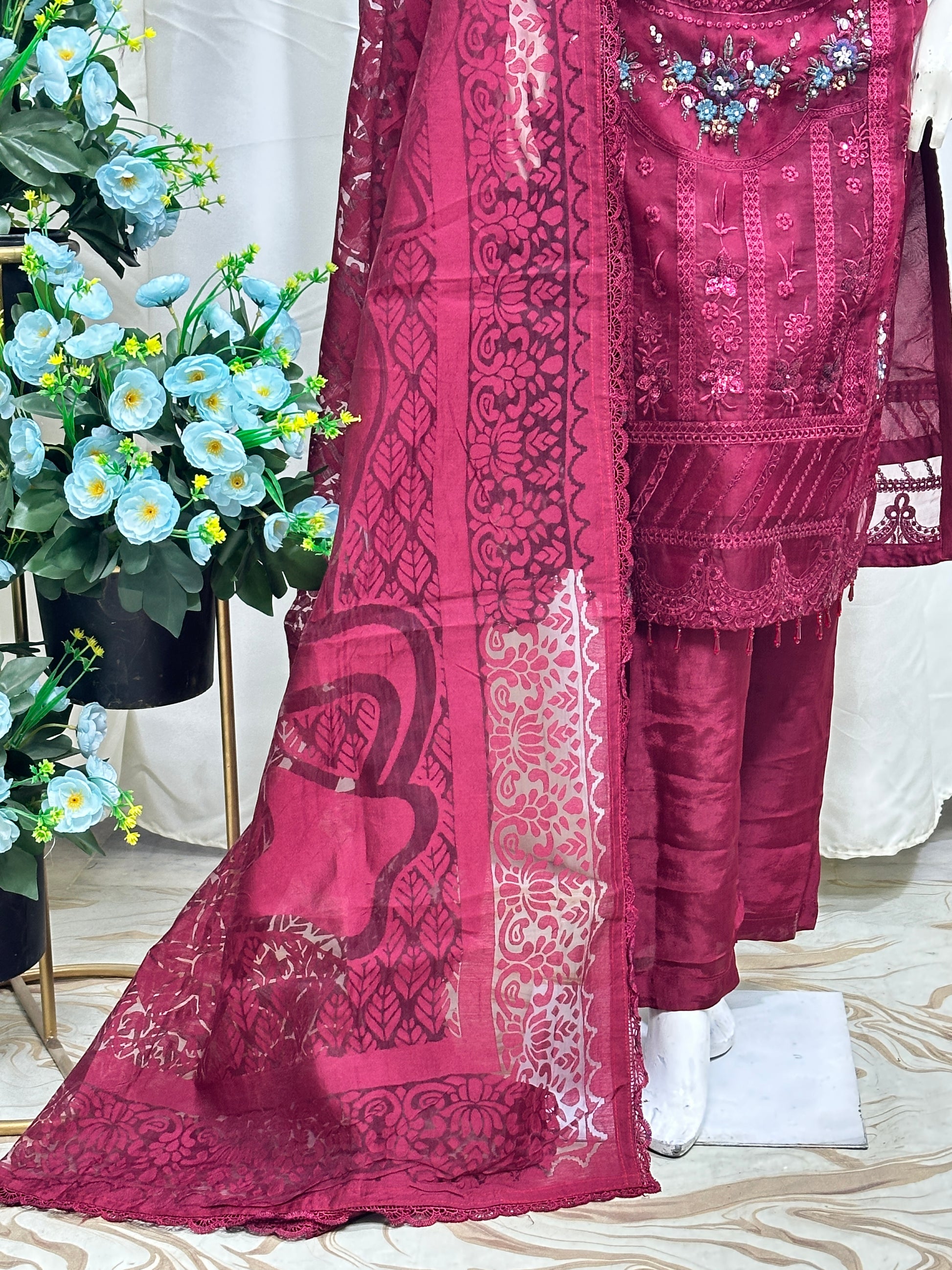 beautifully crafted organza ensemble that blends elegance with detailed artistry. The shirt features a full round neckline, richly embellished with thread and sequin work, enhanced by delicate laser cutting for a refined finish. Paired with a flowyor ganza for graceful movement, the look is completed with a matching organza dupatta—perfect for festive and formal occasions.