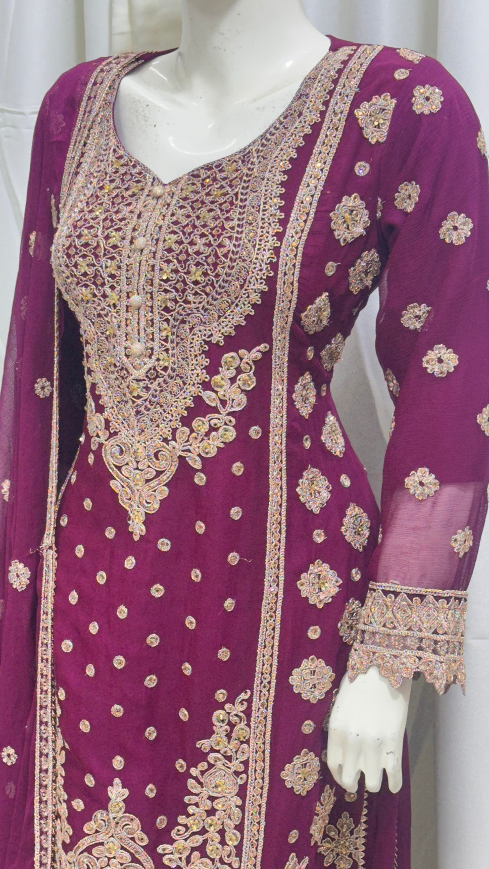 A timeless chiffon shirt adorned pearl setting, bringing a touch of luxury and refinement. Paired with Chiffon palazzo finished with patchwork at the bottom for a modern edge. The fully embroidered Chiffon dupatta with lace detailing completes this graceful ensemble—perfect for festive occasions.