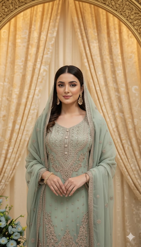 A timeless chiffon shirt adorned pearl setting, bringing a touch of luxury and refinement. Paired with Chiffon palazzo finished with patchwork at the bottom for a modern edge. The fully embroidered Chiffon dupatta with lace detailing completes this graceful ensemble—perfect for festive occasions.