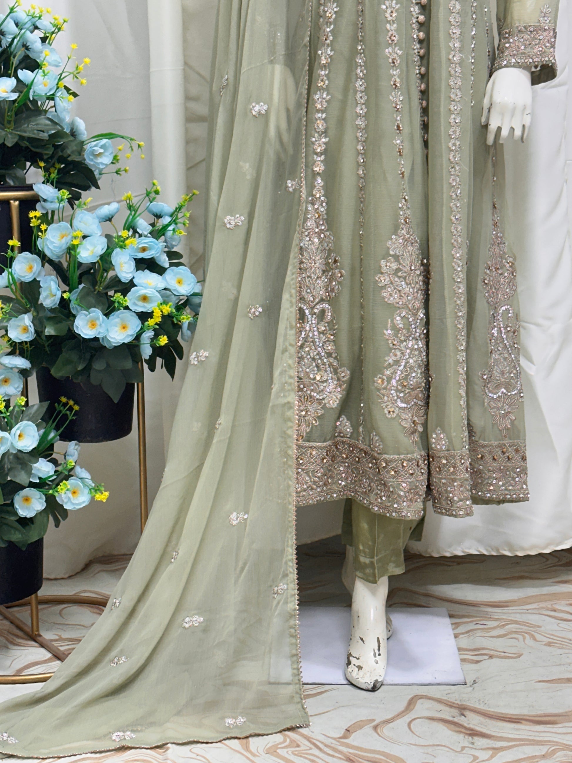Elevate your style game with our 3PC Ready to Wear set. The cutline features a frock, dupatta, and trousers, all made with high-quality materials. The frock is made with chiffon fabric, while the dupatta comes in a matching chiffon fabric. The trouser is made with grip fabric for a comfortable fit. Stand out in this elegant and original ensemble.