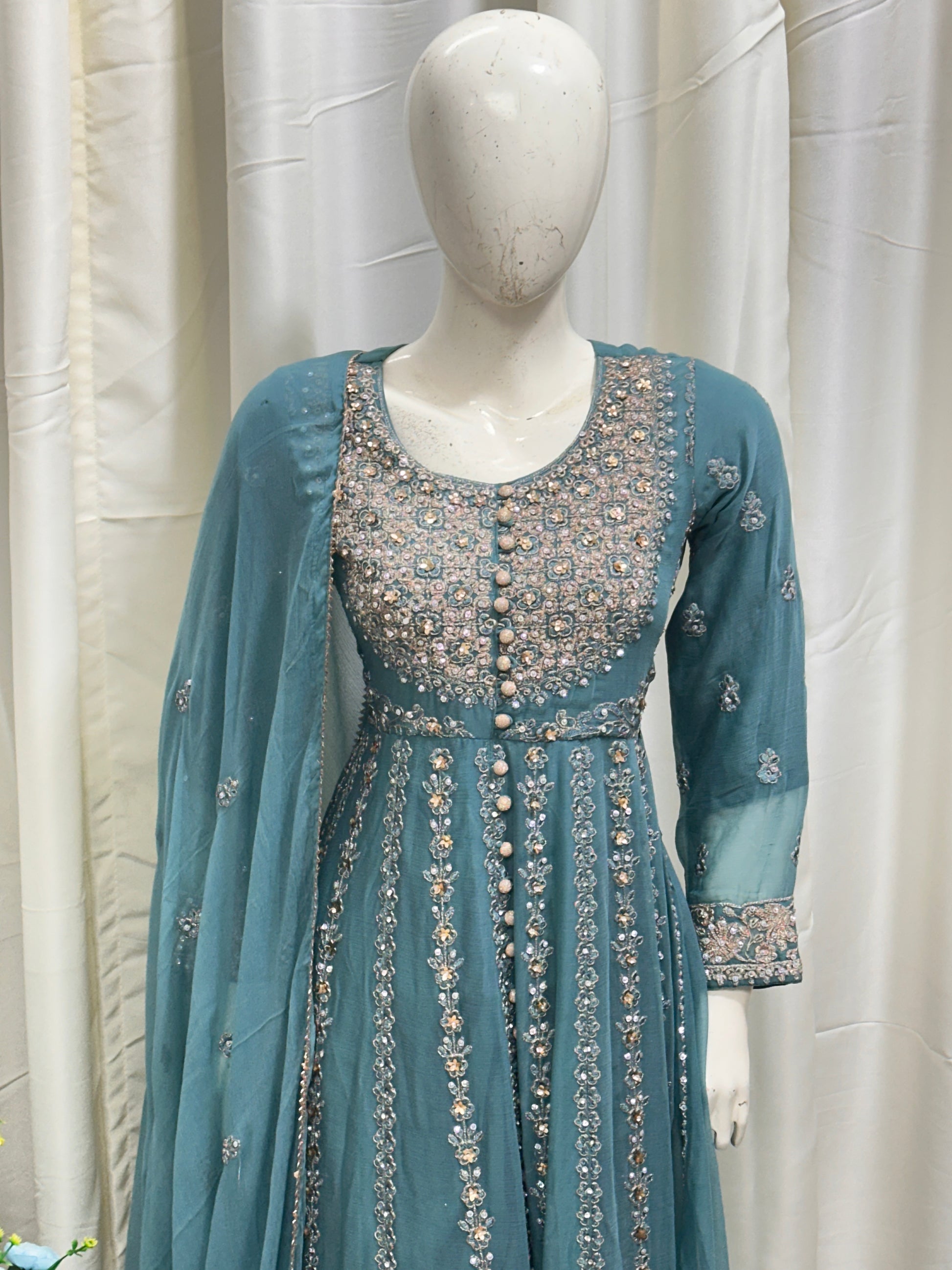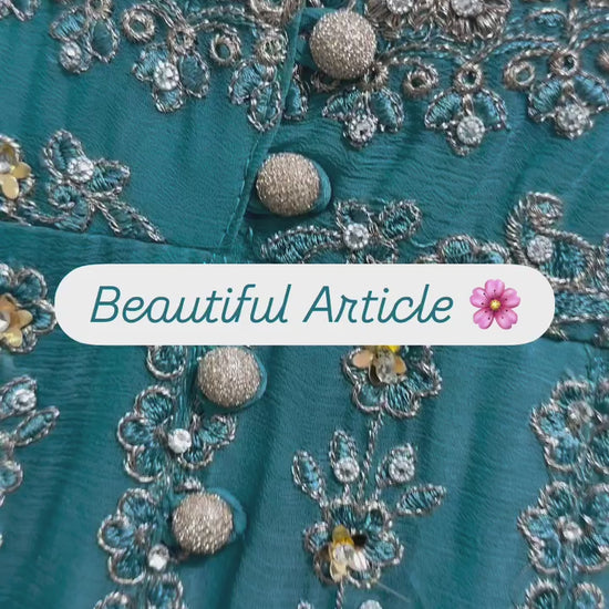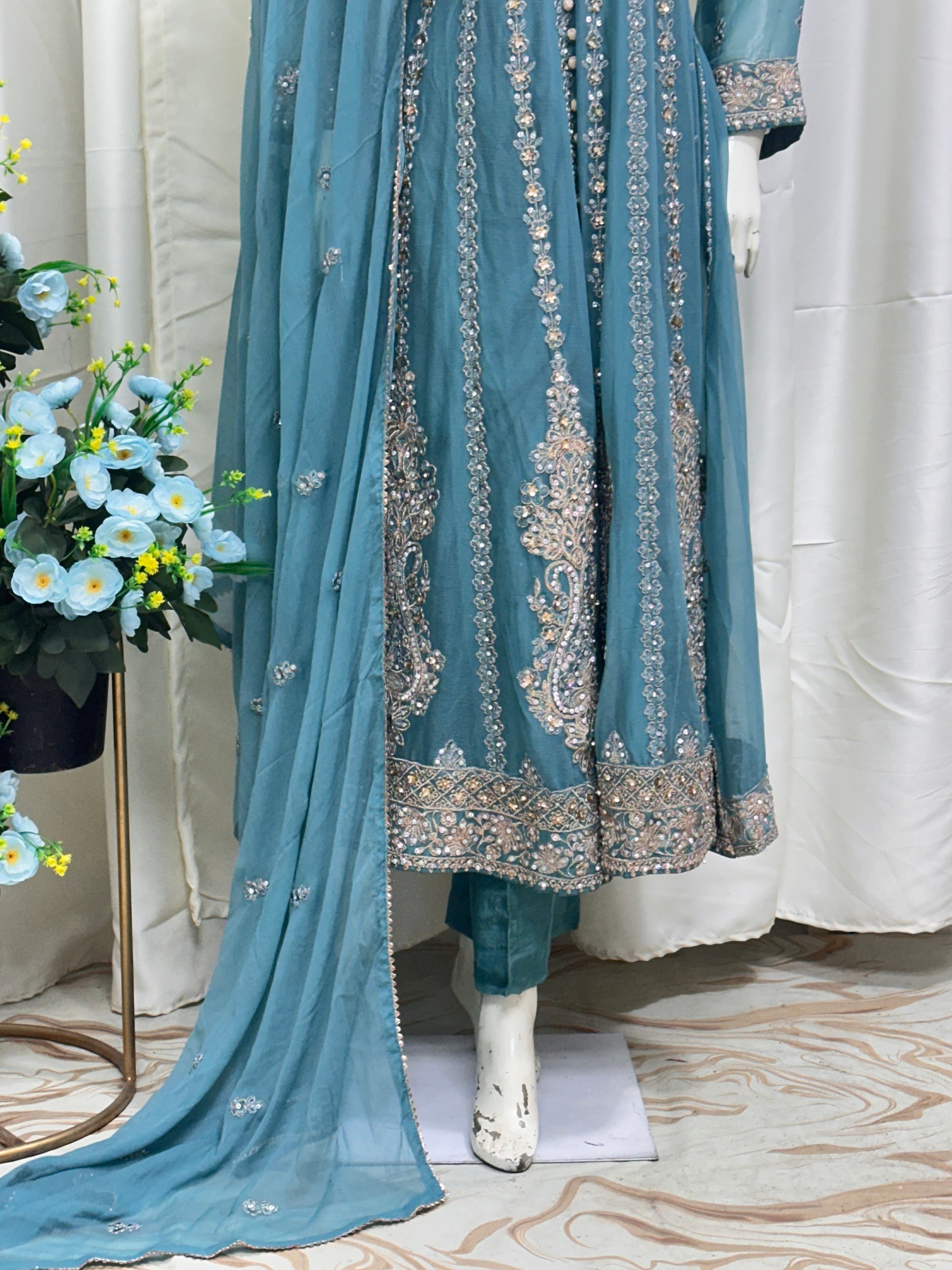 Elevate your style game with our 3PC Ready to Wear set. The cutline features a frock, dupatta, and trousers, all made with high-quality materials. The frock is made with chiffon fabric, while the dupatta comes in a matching chiffon fabric. The trouser is made with grip fabric for a comfortable fit. Stand out in this elegant and original ensemble.