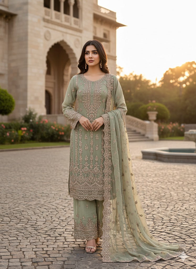 beautifully crafted Chiffon ensemble that blends elegance with detailed artistry. The shirt features a full round neckline, richly embellished with thread and sequin work, enhanced by delicate for a refined finish. Paired with a flowyor Chiffon for graceful movement, the look is completed with a matching Chiffon dupatta—perfect for festive and formal occasions.
