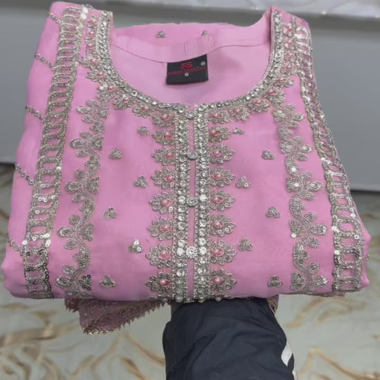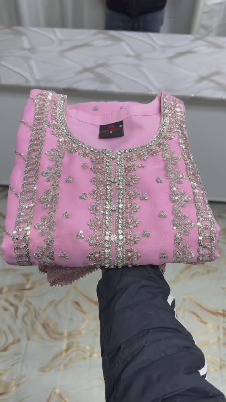 beautifully crafted organza ensemble that blends elegance with detailed artistry. The shirt features a full round neckline, richly embellished with thread and sequin work, enhanced by delicate laser cutting for a refined finish. Paired with a organza for graceful movement, the look is completed with a matching organza dupatta—perfect for festive and formal occasions.
