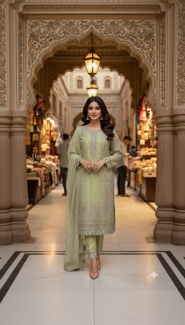 beautifully crafted organza ensemble that blends elegance with detailed artistry. The shirt features a full round neckline, richly embellished with thread and sequin work, enhanced by delicate laser cutting for a refined finish. Paired with a organza for graceful movement, the look is completed with a matching organza dupatta—perfect for festive and formal occasions.