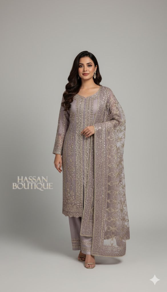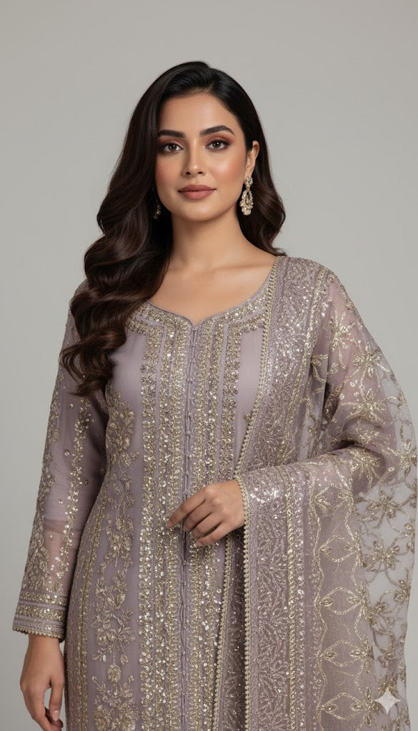 An enchanting chiffon shirt, beautifully crafted with tilla and sequin detailing, finished with delicate sequin Paired with a flowy viscose flapper enhanced with lace finishing, and a heavily embellished organza dupatta that adds a luxurious touch. Perfect for formal evenings and festive occasions.