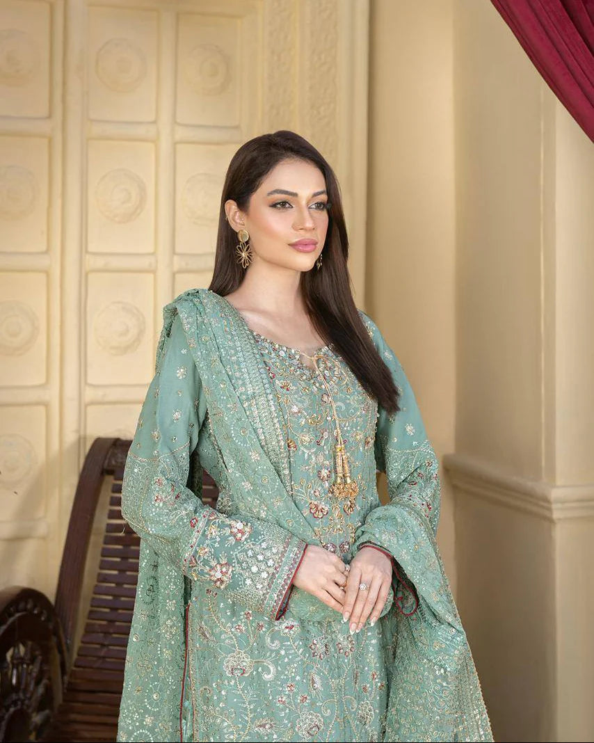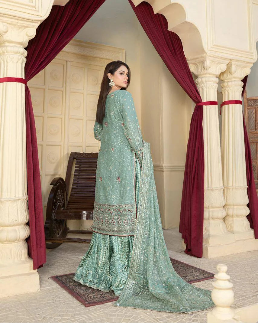 Effortlessly elegant, SJ3325 Black is your go-to outfit for any occasion. The 3PC Ready To Wear set includes a beautiful Chiffon shirt, complemented by a matching Dupatta, and a luxurious Banarasi Sharara. Make a statement wherever you go with this stunning and versatile outfit.