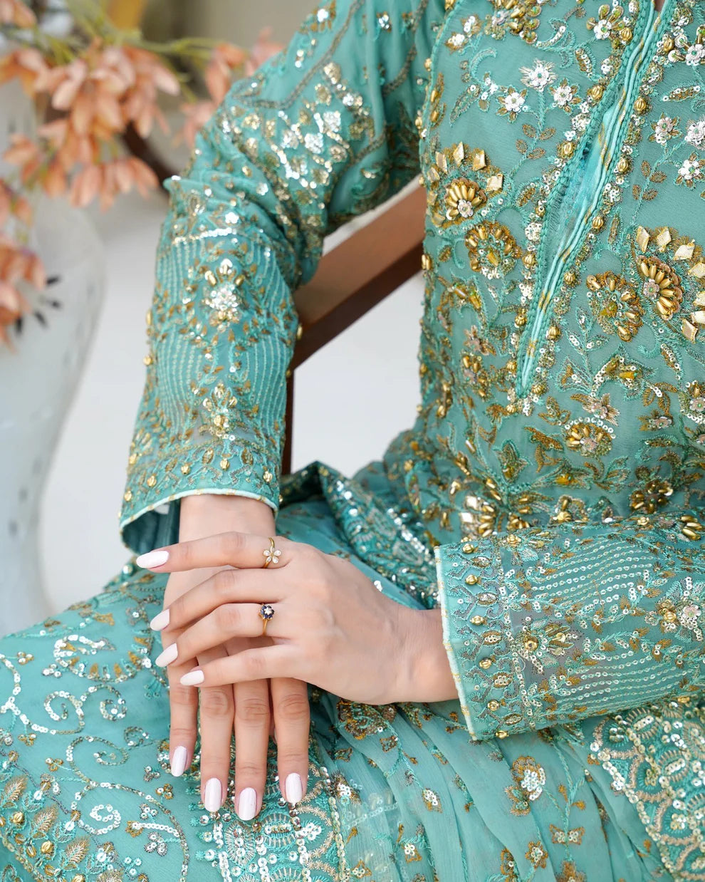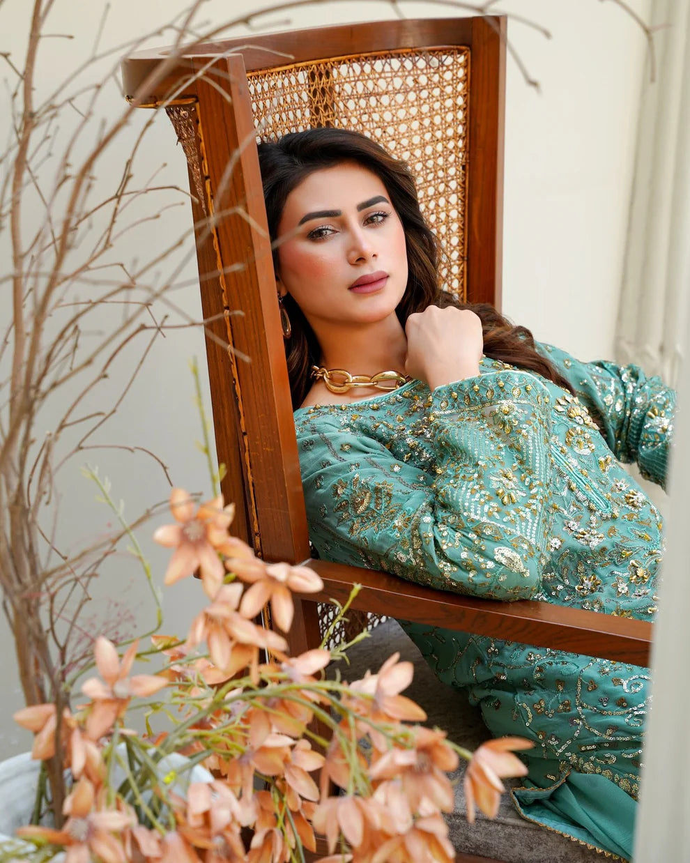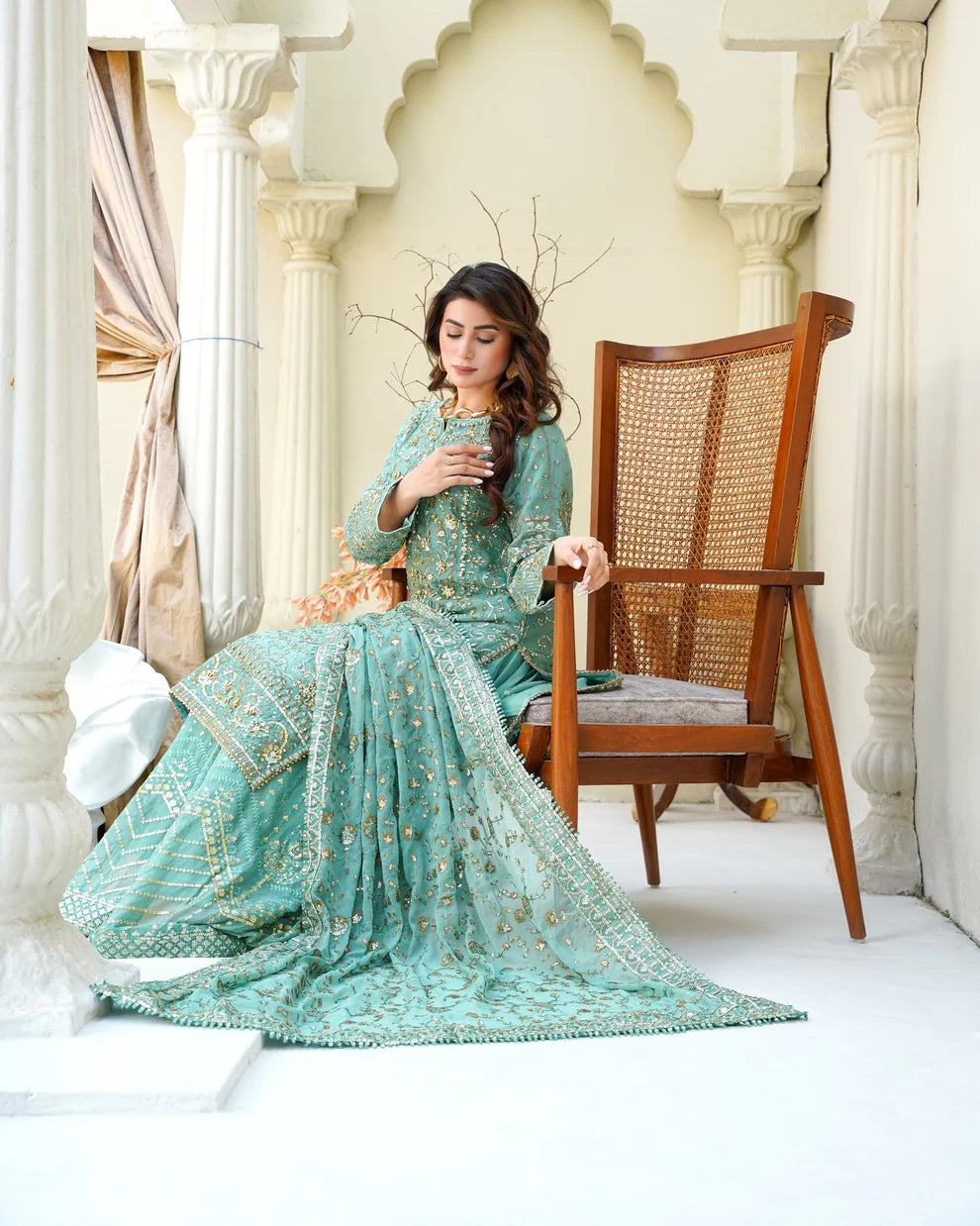 Expertly crafted and ready to wear, the SJ3403 Mehroon set includes a stylish shirt, dupatta, and sharara, all made from high-quality chiffon fabric. With its modern cutline and luxurious texture, this set is perfect for any occasion. Elevate your wardrobe with this sophisticated and versatile ensemble.