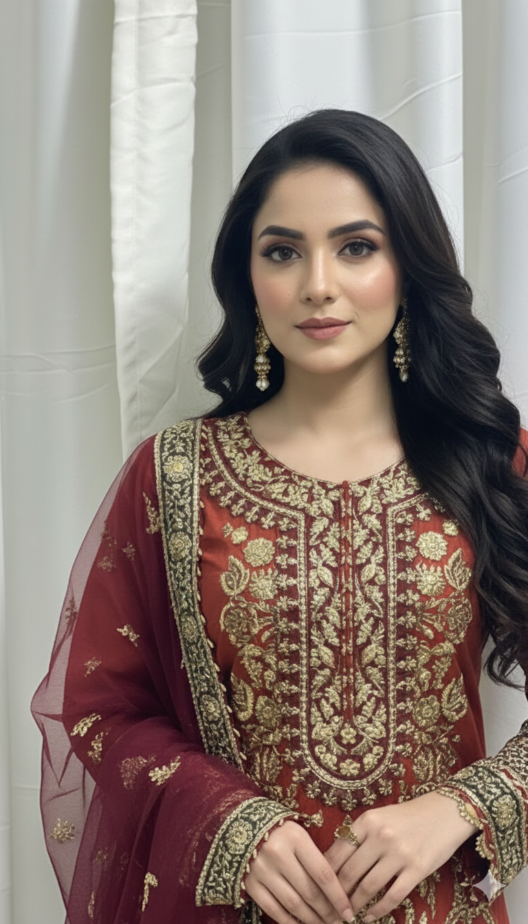 A graceful net shirt paired with a voluminous gharara makes this outfit a timeless festive choice. The matching net dupatta adds a soft, airy charm, creating a balanced blend of tradition and style.