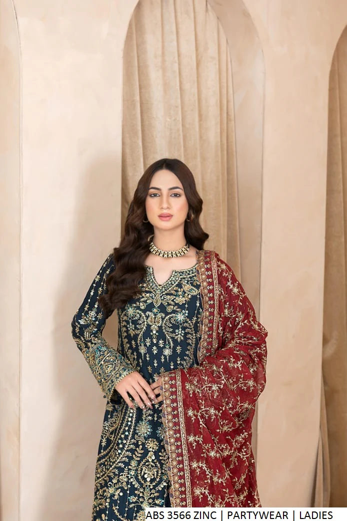 A graceful chiffon shirt adorned with intricate tilla, sequins, and pearl work, creating a rich and elegant appeal. Paired with a fully embroidered chiffon dupatta, detailed with tilla and sequin work for a luxurious touch. Completed with a flowing crush sharara, this ensemble is a timeless choice for festive and formal occasions.