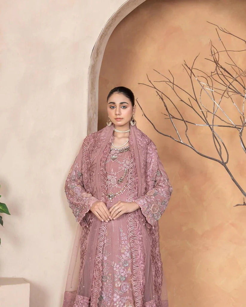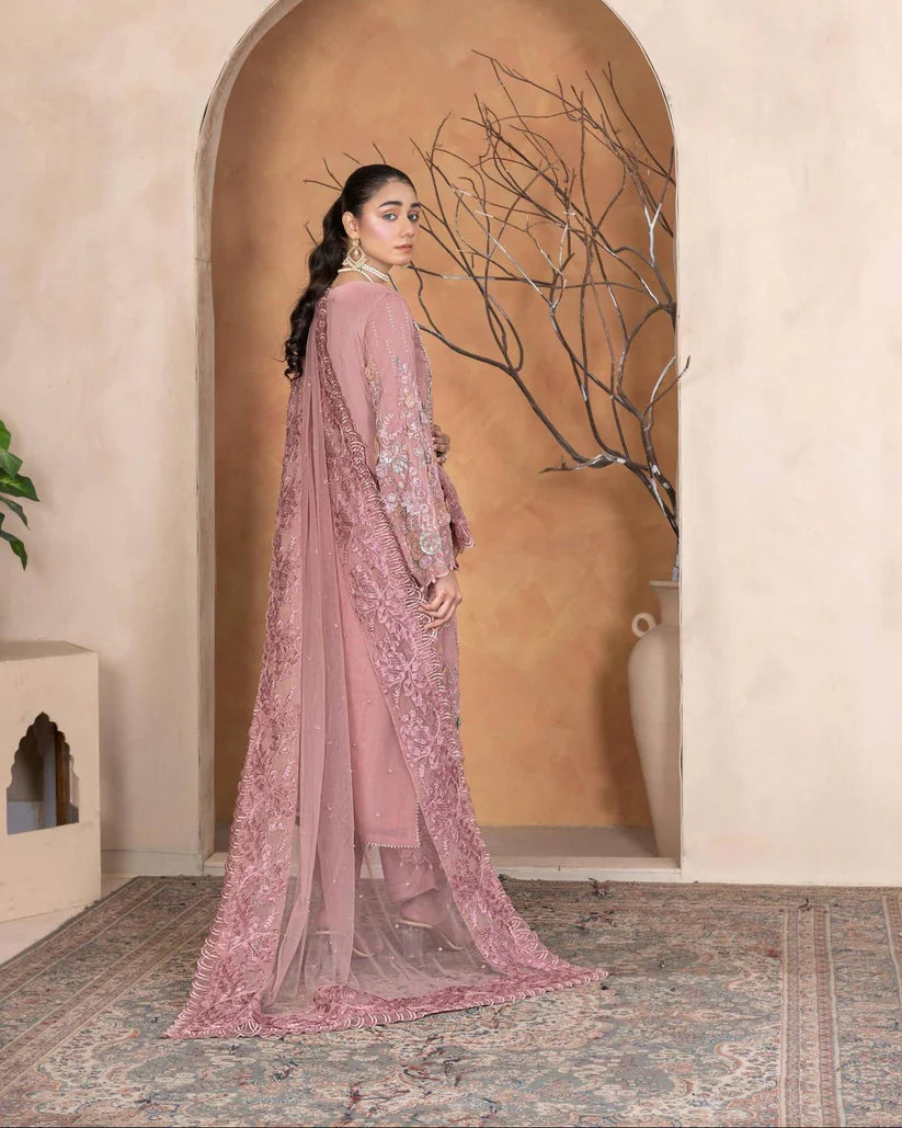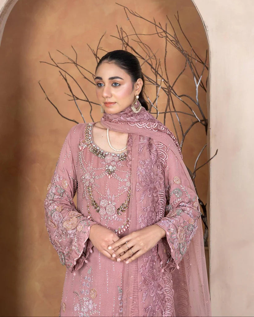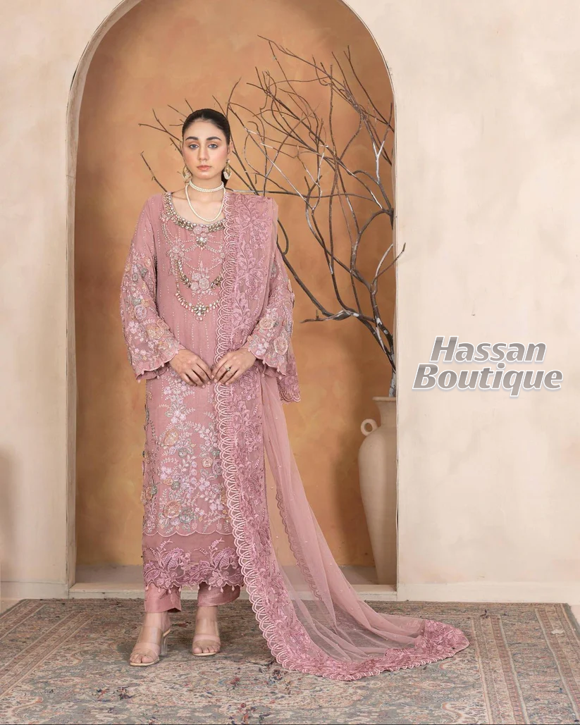 An Chiffon shirt beautifully adorned with stone work and delicate pearl settings, giving it a soft and luxurious appeal. Paired with a smooth grip trouser for a refined fit and a net dupatta that adds a graceful, airy finish — perfect for formal occasions.