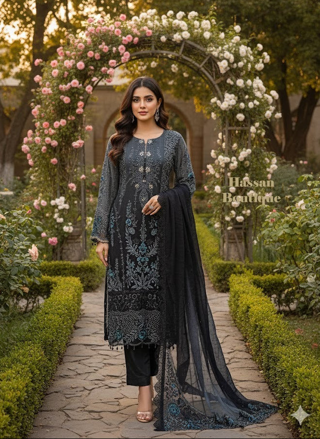 A graceful chiffon shirt beautifully adorned with pearls, stone, and delicate tilla work, offering a timeless and elegant look. Paired with a sleek grip Plazo for effortless comfort, and a matching chiffon dupatta that completes the ensemble with refined sophistication.